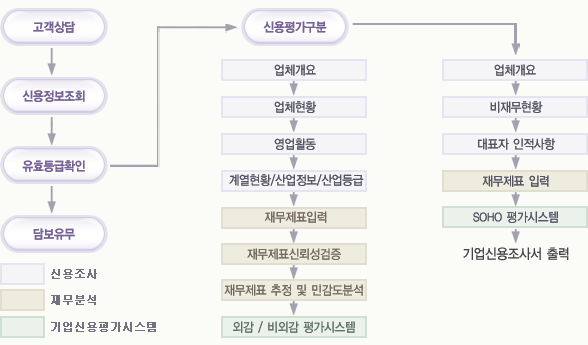 °³¿ä½Å¿ëºÐ¼® ½Ã½ºÅÛÀº ¾÷üÀÇ À繫ÇöȲ ¹× ºñÀ繫ÇöȲ µî¿¡ ´ëÇÑ Á¶»ç ³»¿ëÀ» ¾÷üÀÇ Â¡±¸ÀÚ·á, ¿ÜºÎ°ø½ÃÀÚ·á, ±âŸ ¿ÜºÎ Á¤º¸ µîÀ» Åä´ë·Î Á¤¸®ÇÏ¿© ÀÌÈÄÀÇ À繫ºÐ¼® ¹× ½Å¿ëÆò°¡½Ã½ºÅÛÀ» ÅëÇØ µî±ÞÀ» »êÃâÇϰí ÀÌ¿¡ °üÇÑ ½Å¿ëÁ¶»ç¼¸¦ Ãâ·ÂÇÏ´Â ½Ã½ºÅÛÀÌ´Ù. ½Å¿ëÀ§ÇèÀ» °è·®ÈÇÔÀ¸·Î½á À§ÇèÀÇ È¿À²Àû °ü¸®¸¦ °¡´ÉÇÏ°Ô ÇÏ´Â ½Ã½ºÅÛÀ¸·Î ±â¾÷ÀÇ ½Å¿ë¿¡ ¿µÇâÀ» ¹ÌÄ¡´Â Á¦¹Ý ¿ä¼Ò¸¦ ÆÄ¾ÇÇÏ¿© Æò°¡ÁöÇ¥¸¦ ¼±Á¤Çϰí, ÀÌµé Æò°¡ÁöÇ¥ÀÇ »ê¾÷ ³» ÁöÀ§¸¦ Æò°¡ÇÏ¿© ±â¾÷ÀÇ ½Å¿ëµµ¸¦ ºÐ¼®/Æò°¡ÇÏ´Â ½Ã½ºÅÛÀ¸·Î ¿Ü°¨±â¾÷, ºñ¿Ü°¨±â¾÷, ¿µ¼¼¼Ò±â¾÷(SME:Small and Medium sized Enterprise)½Å¿ëÆò°¡¸ðµâÀ» Á¦°øÇÕ´Ï´Ù. °³³äµµ